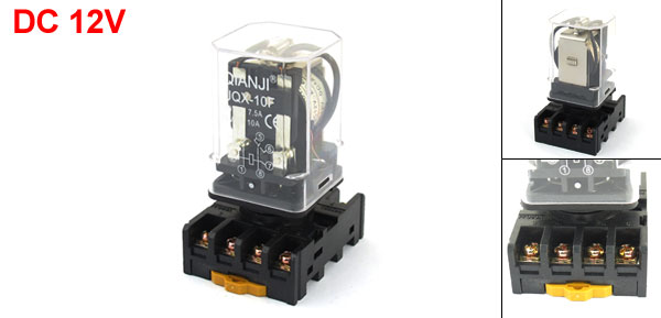 Product Name General Relay + Socket Model No. JQX-10F Coil Voltage DC 12V Contact Capacity 7.5A 250VAC 10A 30VDC Number of Connecting 8 Overall Size (Approx.) 7.7 x 5.4 x 4cm/3" x 2.1" x 1.6" (L*W*H) Shell Material Plastic Main Color Black, Clear Weight 105g Package Content 1 x General Relay
