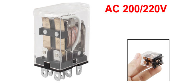 DetailsJQX-13 AC 200/220V Coil 8 Pins DPDT Electromagnetic Relay  Product Name Electromagnetic Relay Model No. JQX-13F Coil Voltage AC 200/220V Contact Capacity 10A AC 250V/DC 28V Type DPDT Pin Quantities 8 Pin Size 6 x 5mm/0.2" x 0.2"(L*W) Overall Size (Approx.) 42 x 21 x 43mm/1.7" x 0.83" x 1.7"(L*W*H) Shell Material Plastic Main Color Silver Tone Net Weight 33g Package Content 1 x Electromagnetic Relay