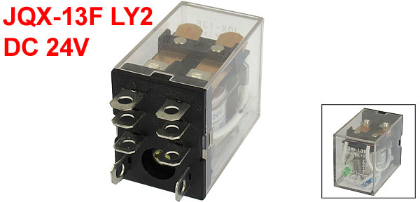 DetailsJQX-13F LY2 DC 24V Coil 8-Pin DPDT Green LED Electromagnetic Relay  Product Name Electromagnetic Relay Model No. JQX-13F/LY2/HH62P Coil Voltage DC 24V Contact Capacity 10A 240VAC /28VDC Type DPDT Pin Quantities 8 Pin Size 6 x 5mm/0.24" x 0.2"(L*W) Overall Size (Approx.) 27 x 20 x 35mm/1.1" x 0.8" x 1.4"(L*W*H) Shell Material Plastic Main Color Clear, Black Net Weight 32g Package Content 1 x Electromagnetic Relay