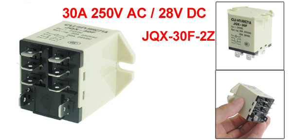 Product Name Power Relay Model JQX-30F-2Z Contact DPDT Pin Number 8 Coil Voltage DC 24V Contact 30A 250V AC / 28V DC Body Size(not included pin) 5.1 x 3.6 x 4cm / 2" x 1.4" x 1.6"(L * W * T) Total Height 4.8cm / 1.9" Material Plastic, Metal Main Color Beige Weight 80g Package Content 1 x Power Relay - Reviews