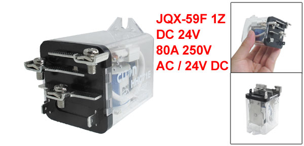 Product Name Power Relay Model JQX-59F 1Z Contact SPDT Pin Number 5 Coil Voltage DC 24V Contact 80A 250V AC / 24V DC Body Size(not included pin) 7.1 x 4.4 x 6.6cm / 2.8" x 1.7" x 2.6"(L * W * T) Total Height 7.9cm / 3.1" Material Plastic, Metal Color See the Picture Weight 243g Package Content 1 x Power Relay - Reviews