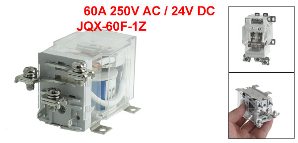 Product Name Power Relay Model JQX-60F-1Z Contact SPDT Pin Number 5 Coil Voltage DC 24V Contact 60A 250V AC / 24V DC Body Size(not included pin) 4.5 x 3.9 x 5.9cm / 1.8" x 1.5" x 2.3"(L * W * T) Total Height 7.2cm / 2.8" Installing Hole Size 0.5 x 0.35cm / 0.2"x 0.14"(L*W) Installing Hole Distance(center) 4 x 3.78cm / 1.6" x 1.49"(L*W) Material Plastic, Metal Color See the Picture Weight 170g Package Content 1 x Power Relay - Reviews