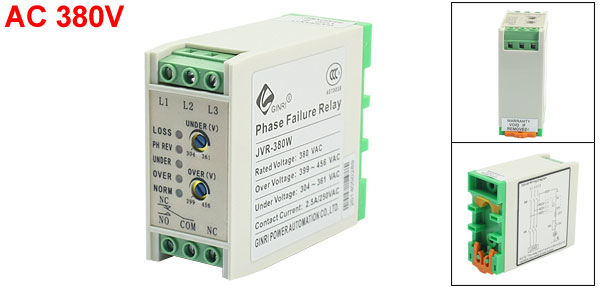 Product Name Voltage and Phase Relay Model JVR-380W Type Three-phase, SPDT Rated Voltage AC 380V Over Voltage Setting AC 399V-456V Under Voltage Setting AC 304V-361V Contact Current 2.5A, AC 250V Conventional Thermal Current 5A Demensions 76 x 30 x 68mm/3.0" x 1.2" x 2.7"(L*W*H) Color White, Green Weight 123g Package Content 1 x Voltage and Phase Relay - Reviews