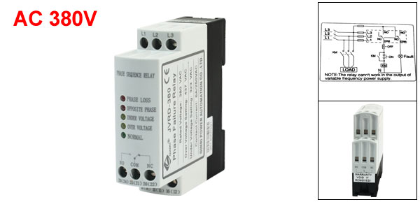 Product Name Phase Faliure Relay Model JVRD Type Three-phase, SPDT Working Voltage AC 380V Output Contact 5A, AC 250V Over Voltage Setting AC 437V Under Voltage Setting AC 323V Power Consumption <= 2W Ambient Temperature -10C to +55C Ambient Humidity 45-85%RH Frequency 50/60Hz Base Rail Mounting Size 35mm Demensions 79 x 23 x 50mm/3.1" x 0.91" x 3.1"(L*W*H) Weight 127g Package Content 1 x Phase Faliure Relay, 1 x Base - Reviews