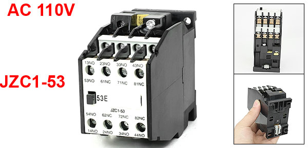 Product Name Contactor Type Relay Model Number JZC1-53 Material Plastic, Metal, Electrical Parts Rated Coil Voltage AC 110V 50Hz Ith 10A Ui 660V AC-15 450VA 360VA DC-13 60W 33W Number of Contact 3P 5NO + 3NC Overall Size(Approx.) 7.5 x 4.4 x 9.6cm / 3'' x 1.7'' x 3.8''(L*W*H) Fix Mounted Hole Dismater 5mm/0.2" Mounted Type 35mm DIN Rail Main Color Black, White Net Weight 430g Package Content 1 x AC Contactor Type Relay - Reviews