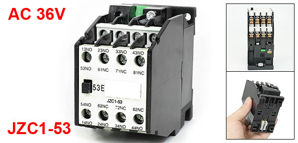 Product Name Contactor Type Relay Model Number JZC1-53 Material Plastic, Metal, Electrical Parts Rated Coil Voltage AC 36V 50Hz Ith 10A Ui 660V AC-15 450VA 360VA DC-13 60W 33W Number of Contact 3P 5NO + 3NC Overall Size(Approx.) 7.5 x 4.4 x 9.6cm / 3'' x 1.7'' x 3.8''(L*W*H) Fix Mounted Hole Dismater 5mm/0.2" Mounted Type 35mm DIN Rail Main Color Black, White Net Weight 428g Package Content 1 x AC Contactor Type Relay - Reviews