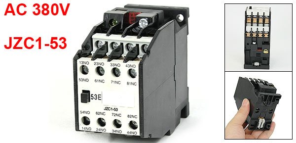 Product Name Contactor Type Relay Model Number JZC1-53 Material Plastic, Metal, Electrical Parts Rated Coil Voltage AC 380V 50Hz Ith 10A Ui 660V AC-15 360VA DC-13 33W Number of Contact 3P 5NO + 3NC Overall Size(Approx.) 7.5 x 4.4 x 9.6cm / 3'' x 1.7'' x 3.8''(L*W*H) Fix Mounted Hole Dismater 5mm/0.2" Mounted Type 35mm DIN Rail Main Color Black, White Net Weight 425g Package Content 1 x AC Contactor Type Relay - Reviews