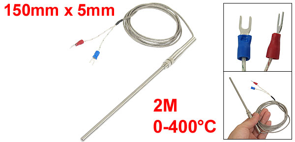 Product Name Thermocouple Type K Type Temperature Range 0-400°C(32-752°F) Probe Diameter 5mm / 0.2" Probe Length 15cm / 6" (Not Included Flexible Section) Thread Diameter 7.8mm / 0.3" Internal Insulation Fibreglass External Shielding Metal Shield Total Length 2M /6.5ft Fork Terminal Spacing 4.1mm / 0.16" Color Silver Tone Weight 50g Package Content 1 x K Type Thermocouple - Reviews
