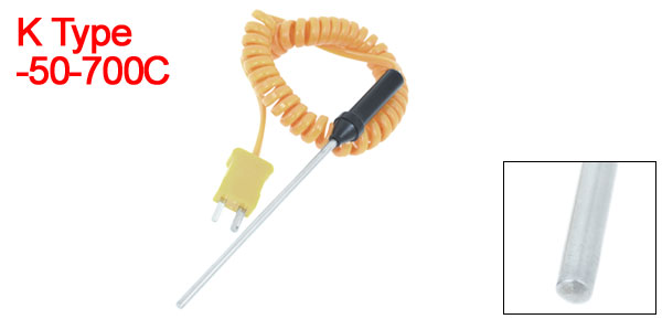 Product Name Thermocouple Probe Type K Type Material Electronic Parts, Plastic Main Color Yellow Temperature Range -50-700C Fork Terminal Spacing 5mm/ 0.197" Probe Size 135 x 3mm/ 5.3" x 0.12"(L*Dia) Total Length 46cm/ 18.1" Cable Length 37cm/ 14.5"((Not Stretch) Weight 27g Package Content 1 x Thermocouple Probe - Reviews