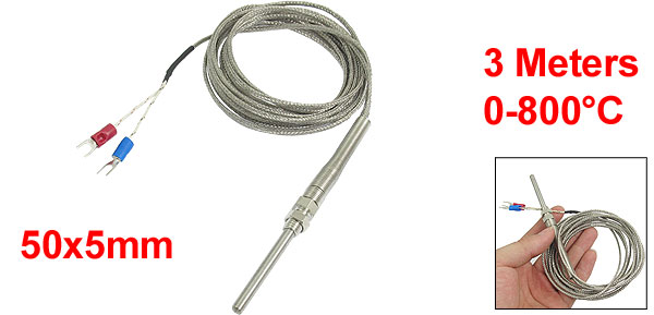K Type 50x5mm 800C Probe Thermocouple Temperature Sensor Cable 9.8ft 3 Meters