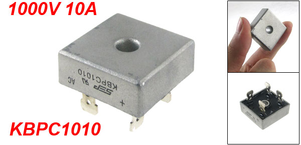 Product Name Bridge Rectifier Model KBPC1010 Max. Average Forward Rectified Current 10A Max. Recurrent Peak Reverse Voltage 1000V Max. RMS Bridge Input Voltage 700V Max. DC Blocking Voltage 1000V Operating Temperature Range -55-125°C Pitch Distance 18mm / 0.7" Terminal Size 6.2 x 16mm / 0.24" x 0.63" (W*L) Dimension 28 x 28 x 11mm / 1.1" x 1.1" x 0.43" (L*W*T) Mounted Hole Dia. 6mm / 0.24" Material Resin, Metal Color Black, Silver Tone Net Weight 26g Package Content 1 x Bridge Rectifier - Reviews