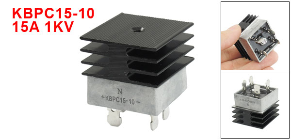 DetailsKBPC15-10 15A 1KV Single Phase Bridge Rectifier Half-Wave White w Heatsink  Product Name Single Phase Bridge Rectifier w Heatsink Model No. KBPC15-10 Output Current 15A Repetitive Peak Reverse Voltage 1KV Pitch Distance 18mm/0.7" 13mm/0.5" 7.5mm/0.3" Rectifier Body Size(No Include Pin) 32 x 32 x 11mm/1.3" x 1.3" x 0.4"(L*W*H) Heatsink Size 34 x 34 x 16mm / 1.3" x 1.3" x 0.6"(L*W*H) Total Length 40mm/1.6" Screw Hole Diameter 3.4mm/0.1" Material Metal Color Black, White Net Weight 58g Package Content 1 x Single Phase Bridge Rectifier wHeatsink