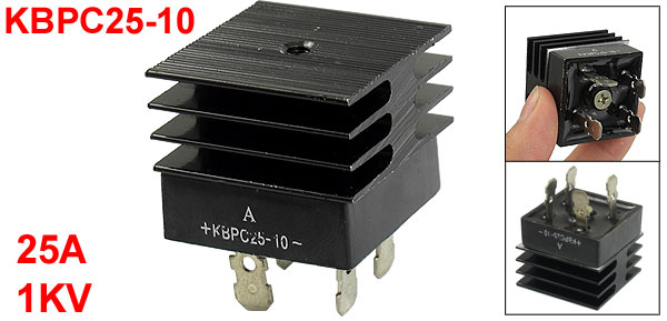 Product Name Single Phase Bridge Rectifier w Heatsink Model No. KBPC25-10 Output Current 25A Repetitive Peak Reverse Voltage 1KV Pitch Distance 18mm/0.7"