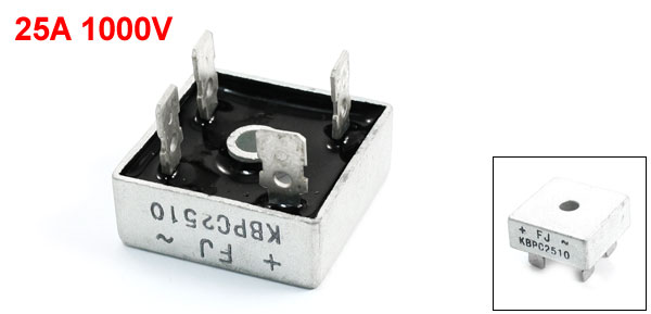 Product Name Bridge Rectifier Model KBPC2510 Repetitive Reverse Voltage 1000V Forward Current 25A Dimension(Not Included Pin) 2.9 x 2.9 x 1.1cm/1.1" x 1.1" x 0.4"(L*W*H) Pin Size 1.1 x 0.6cm/0.43" x 0.24"(L*W) Pin Hole Dia 2mm/0.08" Centre Hole Dia 6mm/0.2" Material Metal Color As Picture Show Net Weight 26g Package Content 1 x Bridge Rectifier - Reviews