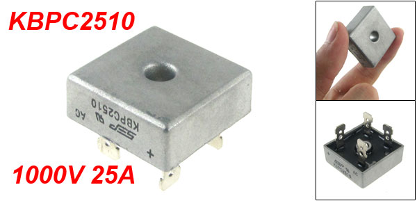 Product Name Bridge Rectifier Model KBPC2510 Max. Average Forward Rectified Current 25A Max. Recurrent Peak Reverse Voltage 1000V Max. RMS Bridge Input Voltage 700V Max. DC Blocking Voltage 1000V Operating Temperature Range -55-125°C Pitch Distance 18mm / 0.7" Terminal Size 6.2 x 16mm / 0.24" x 0.63" (W*L) Dimension 28 x 28 x 11mm / 1.1" x 1.1" x 0.43" (L*W*T) Mounted Hole Dia. 5mm / 0.2" Material Resin, Metal Color Black, Silver Tone Net Weight 24g Package Content 1 x Bridge Rectifier - Reviews