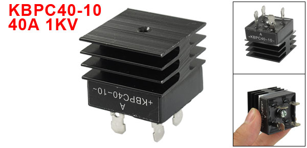 Product Name Single Phase Bridge Rectifier w Heatsink Model No. KBPC40-10 Output Current 40A Repetitive Peak Reverse Voltage 1KV Pitch Distance 18mm/0.7"