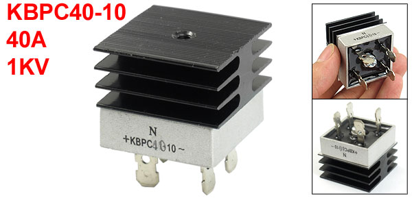 Product Name Single Phase Bridge Rectifier w Heatsink Model No. KBPC40-10 Output Current 40A Repetitive Peak Reverse Voltage 1KV Pitch Distance 18mm/0.7"