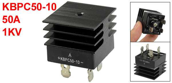 Product Name Single Phase Bridge Rectifier w Heatsink Model No. KBPC50-10 Output Current 50A Repetitive Peak Reverse Voltage 1KV Pitch Distance 18mm/0.7"
