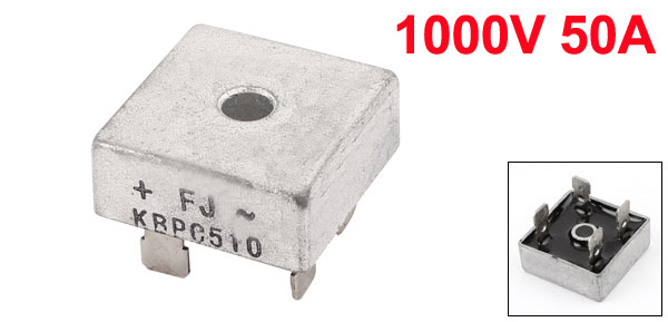 Product Name Single Phase Bridge Rectifier Model No. KBPC5010 Output Current(DC) 50A Repetitive Peak Reverse Voltage(AC) 1000V Fixing Hole Diameter 6mm / 0.24" Overall Size(Approx.) 28 x 28 x 21mm / 1.1" x 1.1" x 0.8"(L*W*H) Material Aluminum, Plastic Net Weight 26g Package Content 1 x Single Phase Bridge Rectifier - Reviews