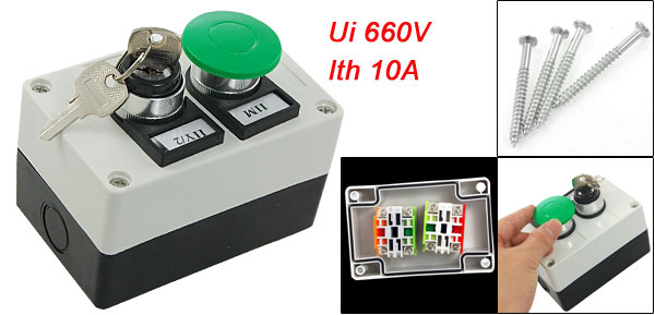 Product Name Keylock Rotary Switch Material Plastic, Metal Ui 660V Ith 10A Mushroom Push Button Action Type Momentary Rotary Switch Mode 2 Position on/off Overall Size(not include button) 11x 7 x 6.5cm/ 4.3" x 2.8" x 2.5" (L*W*H) Mushroom Push Button Knob Dimeter 3.8cm/1.5" Rrary Knob Diameter 2.5cm/1" Mounting Hole Diameter 5mm/ 0.2" Color Green, White, Black Button Color Green Weight 251g Package Content 1 x Keylock Rotary Switch 2 x Keys - Reviews