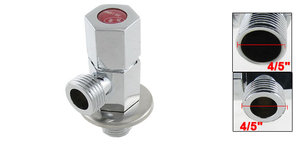 DetailsKitchen Silver Tone 4/5" x 4/5" Male Thread Hexagon Angle Valve  Product Name Angle Stop Valve Design Hexagon Material Chrome Finish, Solid Brass Male Thread Diameter 20.5 x 20.5mm / 4/5" x 4/5" Overall Size (Approx.) 7.5 x 2.5 x 4.5cm / 3" x 1" x 1.8" (L*W*H) Color Silver Tone Weight 117g Package Content 1 x Angle Stop Valve 1 x Round Disc