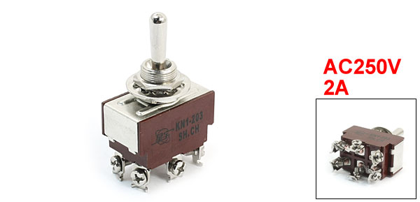 Product Name Toggle Switch Model KN1-203 Type DPDT Voltage & Current AC250V 2A Position 3 Position(ON/OFF/ON) Mounting Hole Diamter 12mm / 0.47" Main Body Size 34 x 20 x 19mm / 1.3" x 0.8" x 0.75"(L*W*H) Overall Height 58mm / 2.3" Material Metal & Resin Color As Picture Shown Weight 42g Package Content 1 x Toggle Switch - Reviews