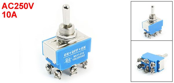 Product Name Toggle Switch Model KN11-213 Type DPDT Position 3 Positions (ON/OFF/ON) Action 1 Momentary, 1 Latching Mounting Hole Diamter 12mm / 0.47" Voltage & Current AC250V, 10A Main Body Size 34 x 20 x 20mm / 1.3" x 0.8" x 0.8"(L*W*H) Overall Height 59mm / 2.3" Material Metal & Resin Color Blue, Silver Tone Weight 41g Package Content 1 x Toggle Switch - Reviews