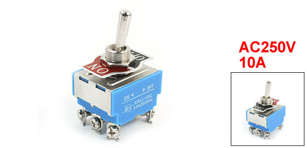Product Name Toggle Switch Model KN11-301 Type DPDT(Latching) Position 2 Positions (ON/OFF) Mounting Hole Diamter 12mm / 0.47" Voltage & Current AC250V, 10A Main Body Size 34 x 28 x 20mm / 1.3" x 1.1" x 0.8"(L*W*H) Overall Height 58mm / 2.3" Material Metal & Resin Color Blue, Silver Tone Weight 49g Package Content 1 x Toggle Switch - Reviews