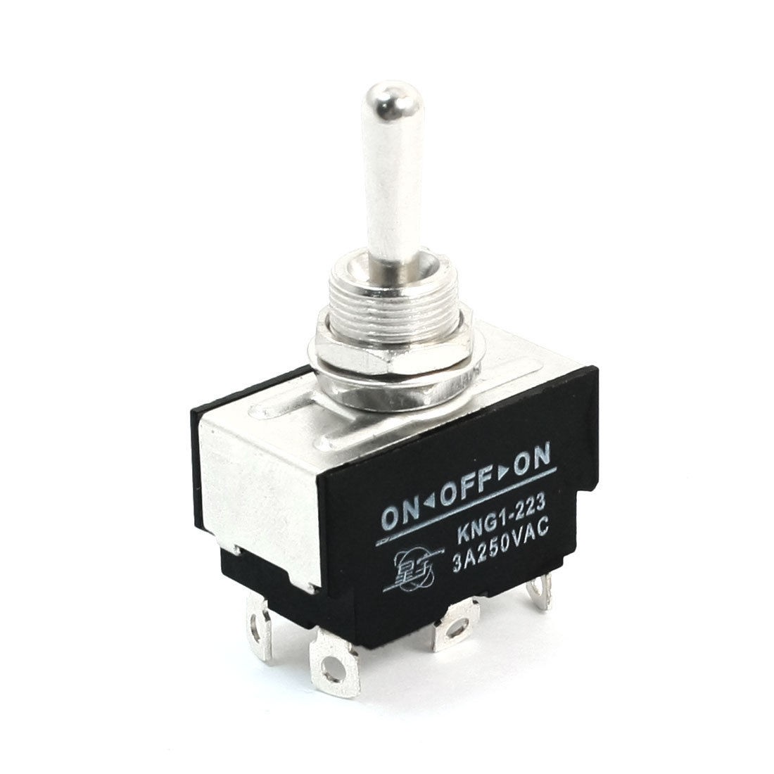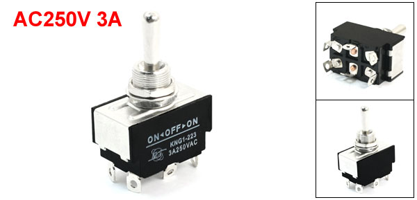 Product Name Toggle Switch Model KNG1-223 Type DPDT Rated Voltage & Current AC250V 3A Position 3 Position(ON/OFF/ON) Mounting Hole Diamter 12mm / 0.47" Main Body Size 34 x 20 x 20mm / 1.3" x 0.8" x 0.8"(L*W*H) Overall Height 55mm / 2.2" Material Metal & Resin Color Black, Silver Tone Weight 35g Package Content 1 x Toggle Switch - Reviews