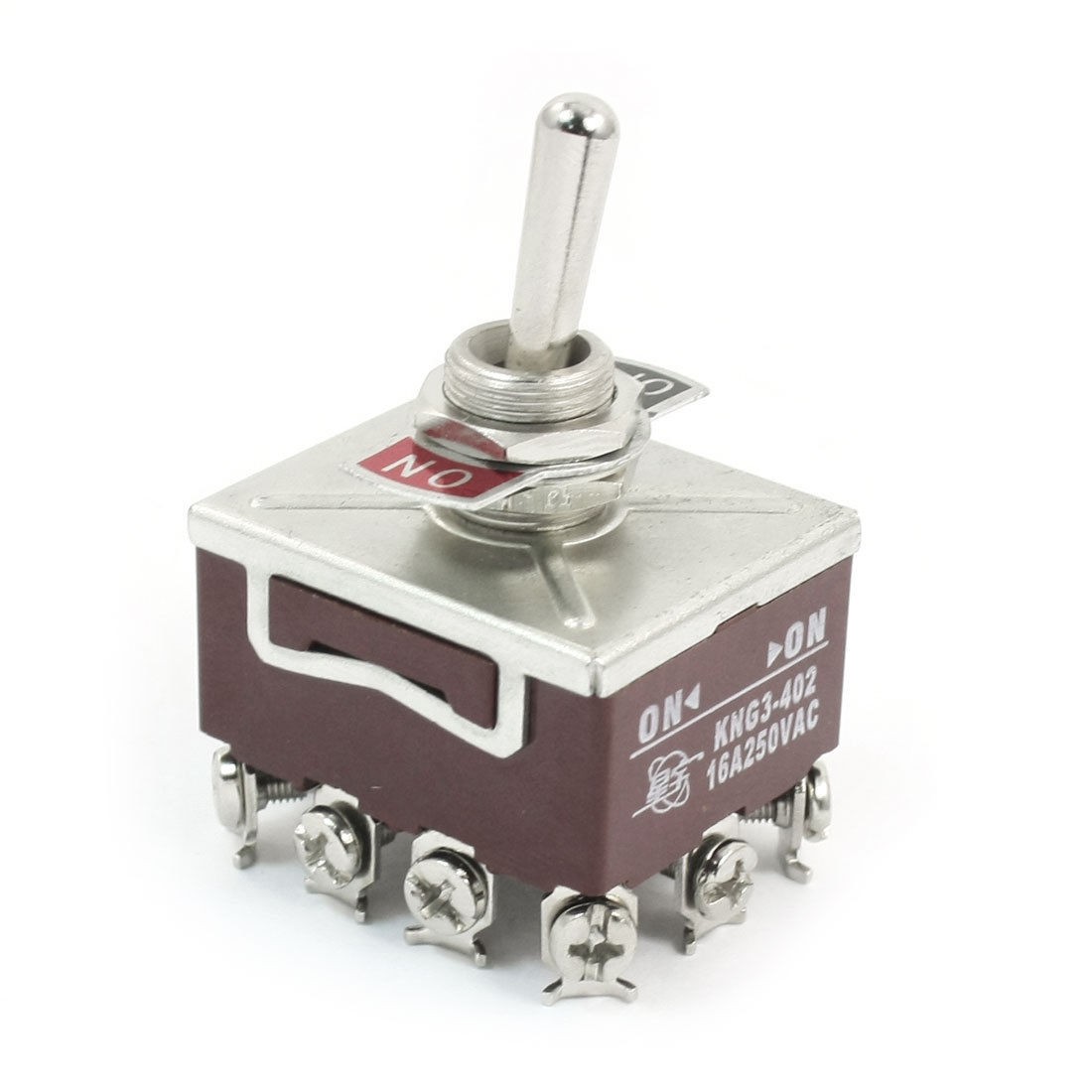 Product Name Toggle Switch Model KNG3-402 Type 4PDT(Latching) Position 2 Positions (ON/ON) Mounting Hole Diamter 12mm / 0.47" Voltage & Current AC250V, 16A Main Body Size 37 x 33 x 21mm / 1.5" x 1.3" x 0.83"(L*W*H) Overall Height 57mm / 2.2" Material Metal & Resin, Plastic Color As Picture Shown Weight 64g Package Content 1 x Toggle Switch - Reviews