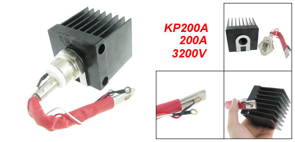 Product Name Phase Control Thyristor Model No. KP200A Average Forward Current 200A Repetitive Peak Reverse Voltage(VRRM) 3200V Heatsink Size 73 x 65 x 76mm / 2.87" x 2.56" x 3.0"(L*W*H) Stud Hole Diameter 8mm / 0.3" Hex Head Diameter 41mm / 1.6" Stud Hole to Hex Head Length 195mm / 7.7" Wire Length 180mm / 7.08"(White)