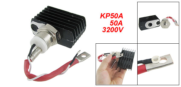 Product Name Phase Control Thyristor Model No. KP50A Average Forward Current 50A Repetitive Peak Reverse Voltage(VRRM) 3200V Heatsink Size 73 x 31 x 43mm / 2.87" x 1.2" x 1.7"(L*W*H) Stud Hole Diameter 7mm / 0.28" Hex Head Diameter 35mm / 1.38" Stud Hole to Hex Head Length 165mm / 6.5" Wire Length 140mm / 5.5"(White)