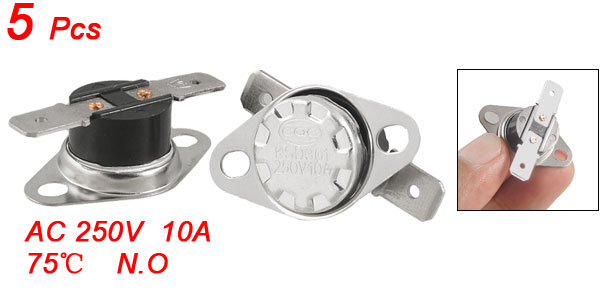 Product Name Temperature Switch Model.No KSD301 Action Type (NO)Normal Open Action Temperature 75C/167F Voltage 10A, AC250V Insulation resistance 100 Mohm Size(Each) 3.4 x 1.2cm/1.3" x 0.47"(L*H) Material Metal, Plastic Color Black, Silver Tone Net Weight 24g Package Content 5 x Temperature Switch Themostat - Reviews
