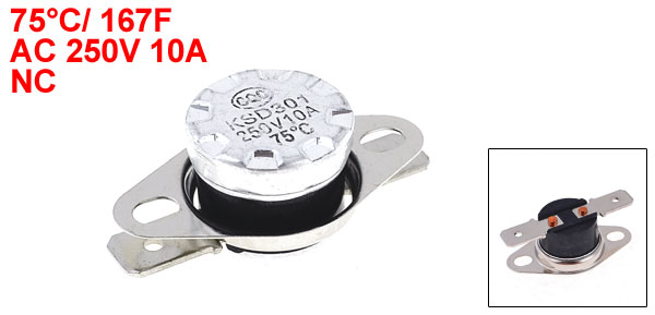 Product Name Temperature Themostat Switch Model.No KSD301 Action Type Normally Close (NC) Action Temperature 75°C/ 167F Current, Voltage 10A, AC250V Size 3.4 x 1.9 x 1.2cm/1.3" x 0.75" x 0.47"(L*W*H) Material Metal, Plastic Color Black, Silver Tone Net Weight 7g Package Content 1 x Temperature Themostat Switch - Reviews