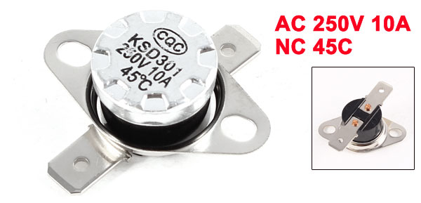 Product Name Temperature Control Switch Model.No KSD301 Action Type Normally Close(NC) Action Temperature 45C Voltage AC 250V Current 10A Insulation resistance Max. 100 Mohm Size 3.4 x 1.6 x 1.2cm/1.3" x 0.6" x 0.5"(L*D*H) Mounting Hole Size 4.4 x 3.5mm/0.2" x 0.1"(L*W) Mounting Hole Center Distance 24mm/0.9" Material Metal, Plastic Color Black, Silver Tone Net Weight 5g Package Content 1 x Temperature Control Switch - Reviews