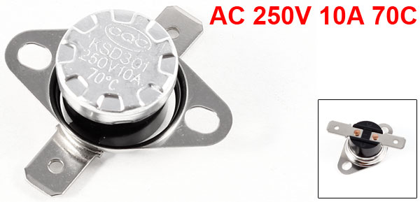 Product Name Temperature Control Switch Model.No KSD301 Action Type Normally Close(NC) Action Temperature 70C Voltage AC 250V Current 10A Insulation resistance Max. 100 Mohm Size 3.4 x 1.6 x 1.2cm/1.3" x 0.6" x 0.5"(L*D*H) Mounting Hole Size 4.4 x 3.5mm/0.2" x 0.1"(L*W) Mounting Hole Center Distance 24mm/0.9" Material Metal, Plastic Color Black, Silver Tone Net Weight 5g Package Content 1 x Temperature Control Switch - Reviews