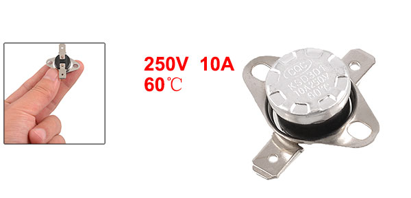 Product Name Temperature Switch Model.No KSD301 Action Type Normal Close(NC) Action Temperature 60C/140F Voltage 10A, AC250V Circuit Resistance 50 Mohm Insulation resistance 100 Mohm Size 3.4 x 1.2cm/1.3" x 0.47"(L*H) Material Metal, Plastic Color Black, Silver Tone Net Weight 7g Package Content 1 x Temperature Switch Themostat - Reviews