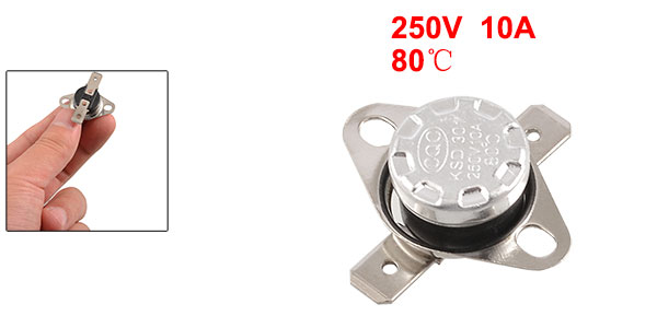 Product Name Temperature Switch Thermostat Model No. KSD301 Action Type Normal Close (N.C.) Action Temperature 80C/176F Voltage 250V 10A Circuit Resistance 50 Mohm Insulation resistance 100 Mohm Size (Each) 3.4 x 1.2cm / 1.3" x 0.47" (L*H) Mounting Hole Spacing 2.5cm / 0.98" Material Metal, Plastic Color Black, Silver Tone Net Weight 6g Package Content 1 x Temperature Switch Thermostat - Reviews