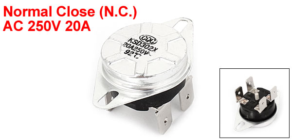 Product Name Temperature Themostat Switch Model.No KSD302X Action Type Normal Close (N.C.) Action Temperature 92C Voltage AC 250V 20A Size(Each) 4.4 x 2.7 x 2.3cm/1.73" x 1.1" x 0.9"(L*T) Material Metal, Plastic Color Black, Silver Tone Net Weight 12g Package Content 1 x Temperature Themostat Switch - Reviews