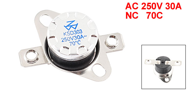 Product Name Temperature Control Switch Thermostat Model.No KSD303 Action Type NC Action Temperature 70C Voltage AC 250V 30A Size(Each) 3.3 x 3.2 x 1.2cm/2" x 1.4" x 0.7"(L*W*T) Mounted Size 5 x 3mm/0.2" x 0.12"(L*W) Mounting Hole Center Distance 2.4cm/0.94" Material Metal, Plastic Color Black, Silver Tone Net Weight 4g Package Content 1 x Temperature Control Switch Thermostat - Reviews