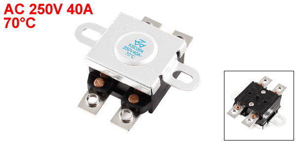 Product Name Temperature Control Switch Thermostat Model.No KSD304 Action Type NC Action Temperature 70C Voltage AC 250V 40A Size(Each) 5 x 4.7 x 1.8cm/2" x 1.9" x 0.7"(L*W*T) Mounted Size 8 x 4mm/0.31" x 0.16"(L*W) Mounting Hole Center Distance 3.9cm/1.5" Material Metal, Plastic Color Black, Silver Tone Net Weight 21g Package Content 1 x Temperature Control Switch Thermostat - Reviews