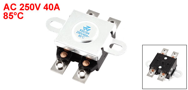 Product Name Temperature Control Switch Thermostat Model.No KSD304 Action Type NC Action Temperature 85C Voltage AC 250V 40A Size(Each) 5 x 4.7 x 1.8cm/2" x 1.9" x 0.7"(L*W*T) Mounted Size 8 x 4mm/0.31" x 0.16"(L*W) Mounting Hole Center Distance 3.9cm/1.5" Material Metal, Plastic Color Black, Silver Tone Net Weight 21g Package Content 1 x Temperature Control Switch Thermostat - Reviews