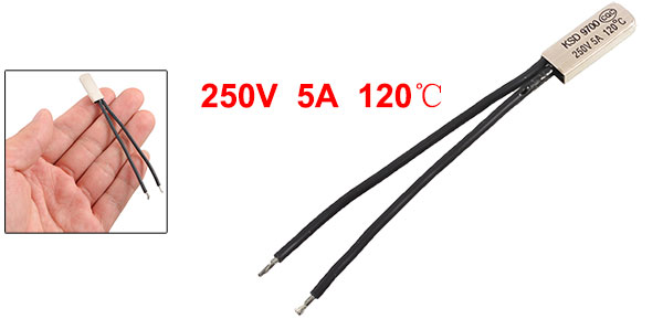 Product Name Temperature Control Switch Model.No KSD9700 Material Plastic, Bimetal Contact NC(Normal Close) Rated Voltage 250V Current 5A Max Rated Disconnection Temperature 120C Color Black, White Cable Length 8cm/ 3.1" Head Dimension 20 x 8 x 3mm/0.78" x 0.31" x 0.12"(L*W*T) Net Weight 4g Package Content 1 x Temperature Control Switch - Reviews
