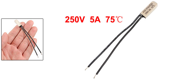 Product Name Temperature Control Switch Model.No KSD9700 Material Plastic, Bimetal Contact NC(Normal Close) Rated Voltage 250V Current 5A Max Rated Disconnection Temperature 75C Color Black, White Cable Length 8cm/ 3.1" Head Dimension 20 x 8 x 3mm/0.78" x 0.31" x 0.12"(L*W*T) Net Weight 4g Package Content 1 x Temperature Control Switch - Reviews