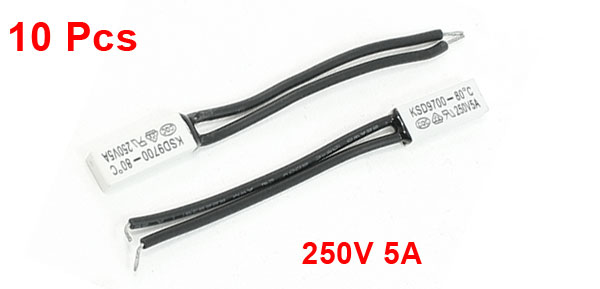 Product Name Temperature Control Switch Model.No KSD9700 Material Plastic, Bimetal Contact NC(Normal Close) Rated Voltage 250V Current 5A Max Rated Disconnection Temperature -80C Color Black, White Cable Length 8cm/ 3.1" Head Dimension 20 x 8 x 3mm/0.78" x 0.31" x 0.12"(L*W*T) Net Weight 24g Package Content 10 x Temperature Control Switch - Reviews
