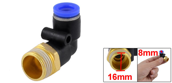 Product Name Pneumatic Quick Fittings Design L Shaped Material Plastic, Metal Thread Type Male Mounting Thread Dia 16mm/ 3/8" PT Tube Inner Dia 8mm Total Size (Approx) 3.8 x 3 x 1.6cm/ 1.5" x 1.2" x 0.6" (L*W*T) Color Black, Blue, Gold Tone Weight 20g Package Content 1 x Pneumatic Quick Fittings - Reviews