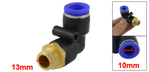 Product Name Pneumatic Quick Fittings Design L Shaped Material Plastic, Metal Thread Type Male Mounting Thread Dia 13mm/ 1/4" PT Tube Inner Dia 10mm Total Size (Approx) 4 x 3 x 1.6cm/ 1.6" x 1.2" x 0.6" (L*W*T) Color Black, Blue, Gold Tone Weight 32g Package Content 1 x Pneumatic Quick Fittings - Reviews