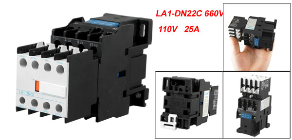 Product Name AC Contactor Model Number LA1-DN22C Material Plastic, Metal, Electrical Parts Coil AC 110V Ith 25A AC Contactor Contact 3 NO, 1NC auxilary Contact 2 NO, 2NC Ui 660V AC-3 Ue(V) 220 380 660 Ie(A) 12 12 8.9 Pe(Kw) 3 5.5 7.5 Overall Size (Approx.) 11 x 7.5 x 4.5cm /4.3" x 3" x1.7" (L*W*H) Color Black, White, Blue Net Weight 377g Package Content 1 x AC Contactor - Reviews