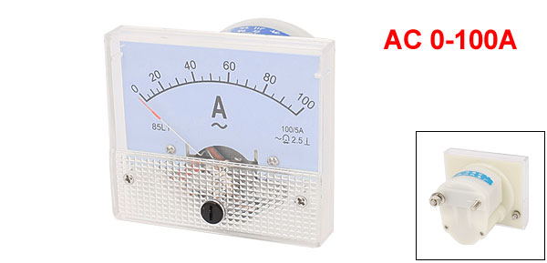 Product Name Analog Ammeter Model 85L1 Measuring Current Range AC 0-100A Accuracy Class 2.5 Meter Face Size(Approx.) 64 x 56 x 10mm / 2.5" x 2.2" x 0.4" (L*W*H) Total Thickness 60mm / 2.4" Mounting Thread Dia. 4mm/ 0.16", 3mm/ 0.12" Material Plastic, Electronic Components Main Color White, Beige Weight 78g Package Content 1 x Analog Ammeter