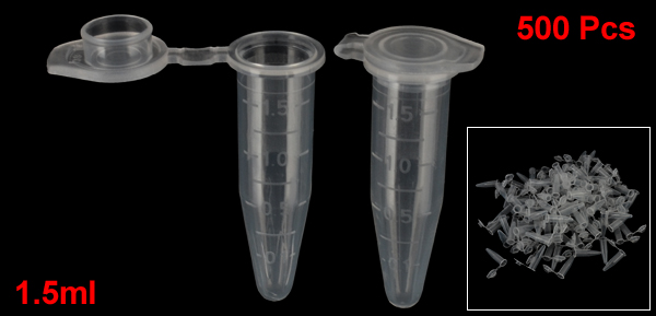 DetailsLab Graduated Disposable Centrifuge Tubes Clear 1.5ml w Caps 500 Pcs  Product Name Centrifuge Tube Material Plastic Capacity 1.5ml Overall Size (Approx.) 4 x 1.3cm/ 1.6" x 0.52" (L*D) Color Clear Net Weight 284g Package Content 500 (±2%) x Centrifuge Tube